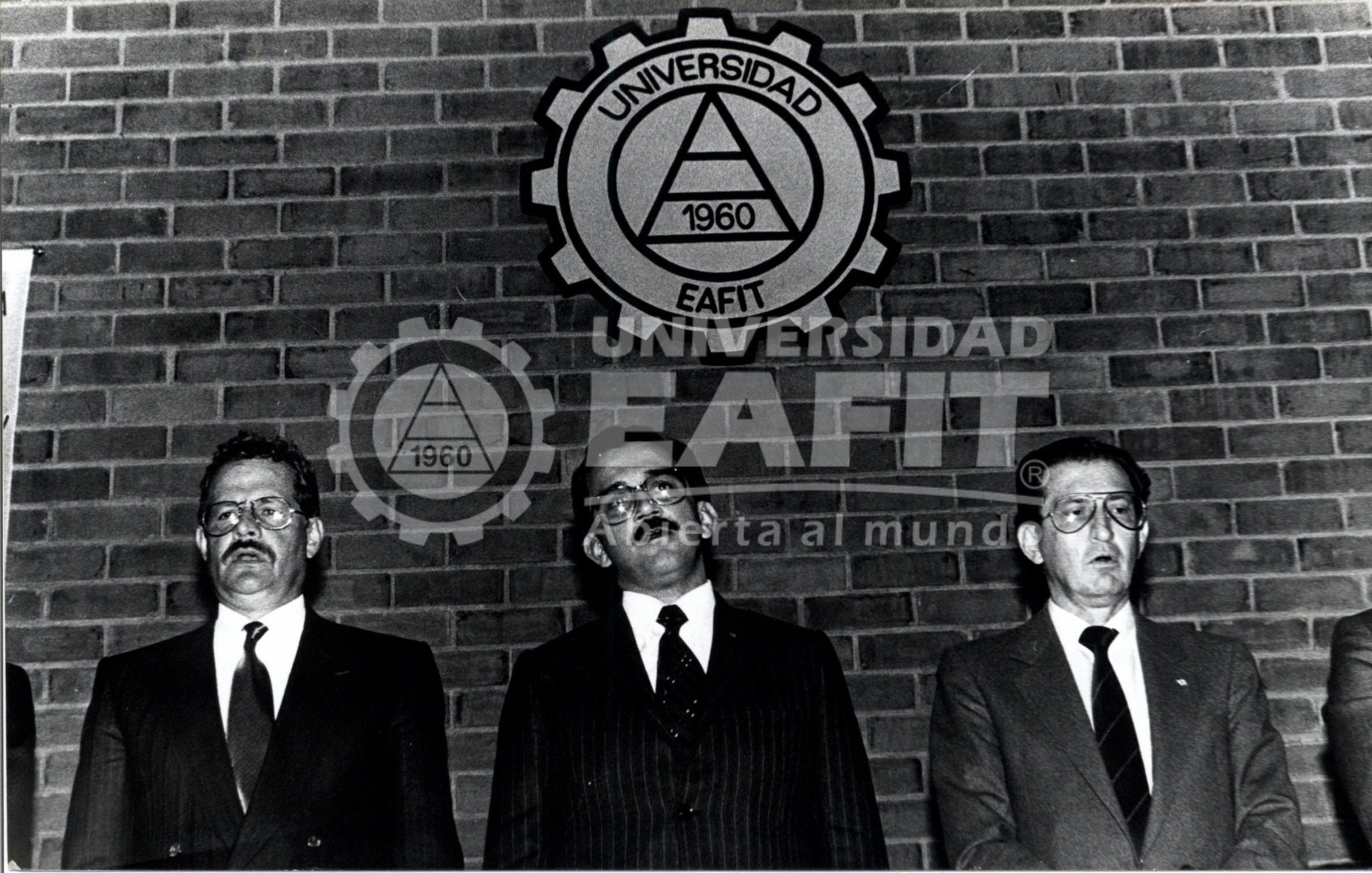 Fotografía tomada durante la inauguración primer colegio bienal de informática, celebrada el 31 de junio de 1990 en el Auditorio Fundadores de la Universidad. Aparecen en esta fotografía : Guillermo Sanín, Rector Universidad Eafit ; Omar Florez Vélez, Alcalde de Medellín y Eduardo Zuluaga, jefe de Ingeniería de Sistemas.