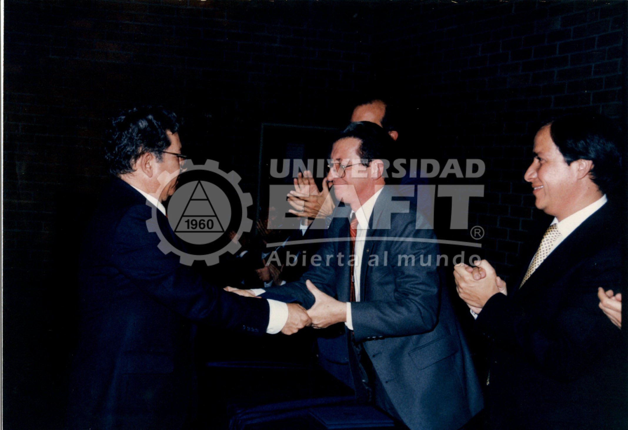 Fotografía tomada durante la entrega del diploma al profesor titular III, máxima distinción dentro del Escalafón Docente de Eafit al Doctor Hernando Bedoya Fernandez, durante la sesión de grado colectivo en diciembre del año 1988. Lo acompañan en esta fotografía Juan Rafael Cárdenas Gutiérrez, miembro del Consejo Superior ; Guillermo Sanín Arango, Rector de la Universidad Eafit y Néstor González Gaviria, miembro del Consejo Superior.