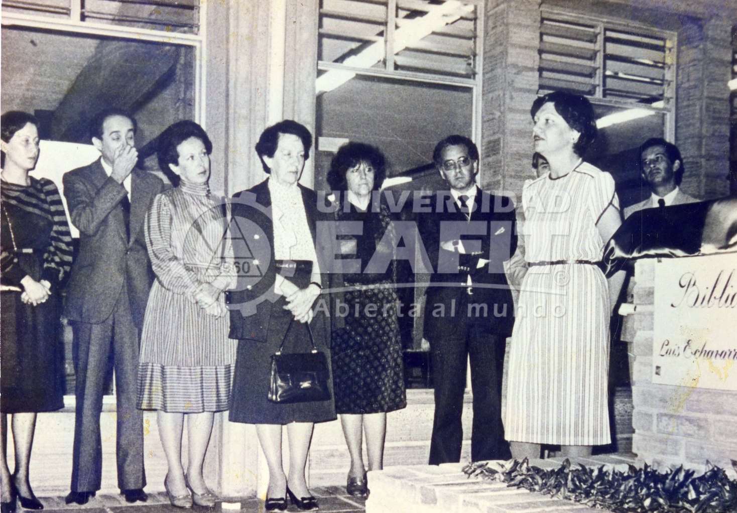 La primera fotografía fue tomada durante el descubrimiento de la placa de homenaje a Luis Echavarría Villegas en el edificio de la Biblioteca, en agosto de 1982. El 23 de abril de 1975 se efectuó el traslado de la Biblioteca a su nuevo edificio, en el bloque 2, hoy bloque 29. En la instalación hubo una intervención de Don Luis Echavarría Villegas, Presidente del Consejo Superior. En su honor y a raíz de su muerte en 1982, se daría el nombre a la Biblioteca, como homenaje a quien fue un desvelado propulsor de todos los proyectos de EAFIT en sus primeros veintidos años. La segunda fotografía retrata a la placa de la Biblioteca desde una vista frontal, en el año 1990.
