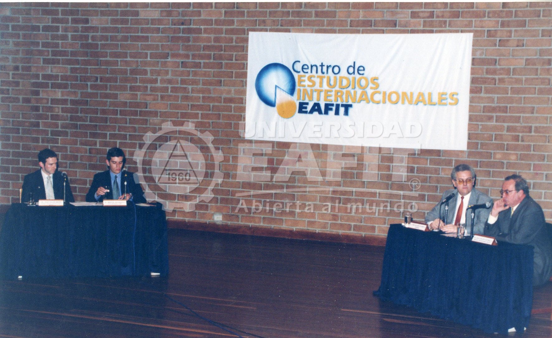 Fotografía tomada durante la inauguaración del Centro de Estudios Internacionales - Fedesarrollo, en la que se retratan directivos y conferenciantes, desde una vista lateral. Se desconoce el lugar de la fotografía.