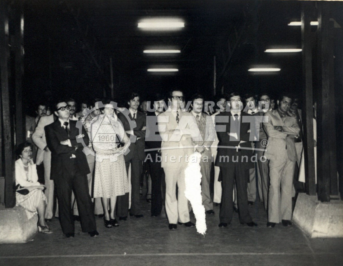 Fotografía tomada durante la inauguración del Centro de Egresados de la Universidad, el 3 de diciembre de 176, en la que se retratan directivos y asistentes desde una vista frontal.