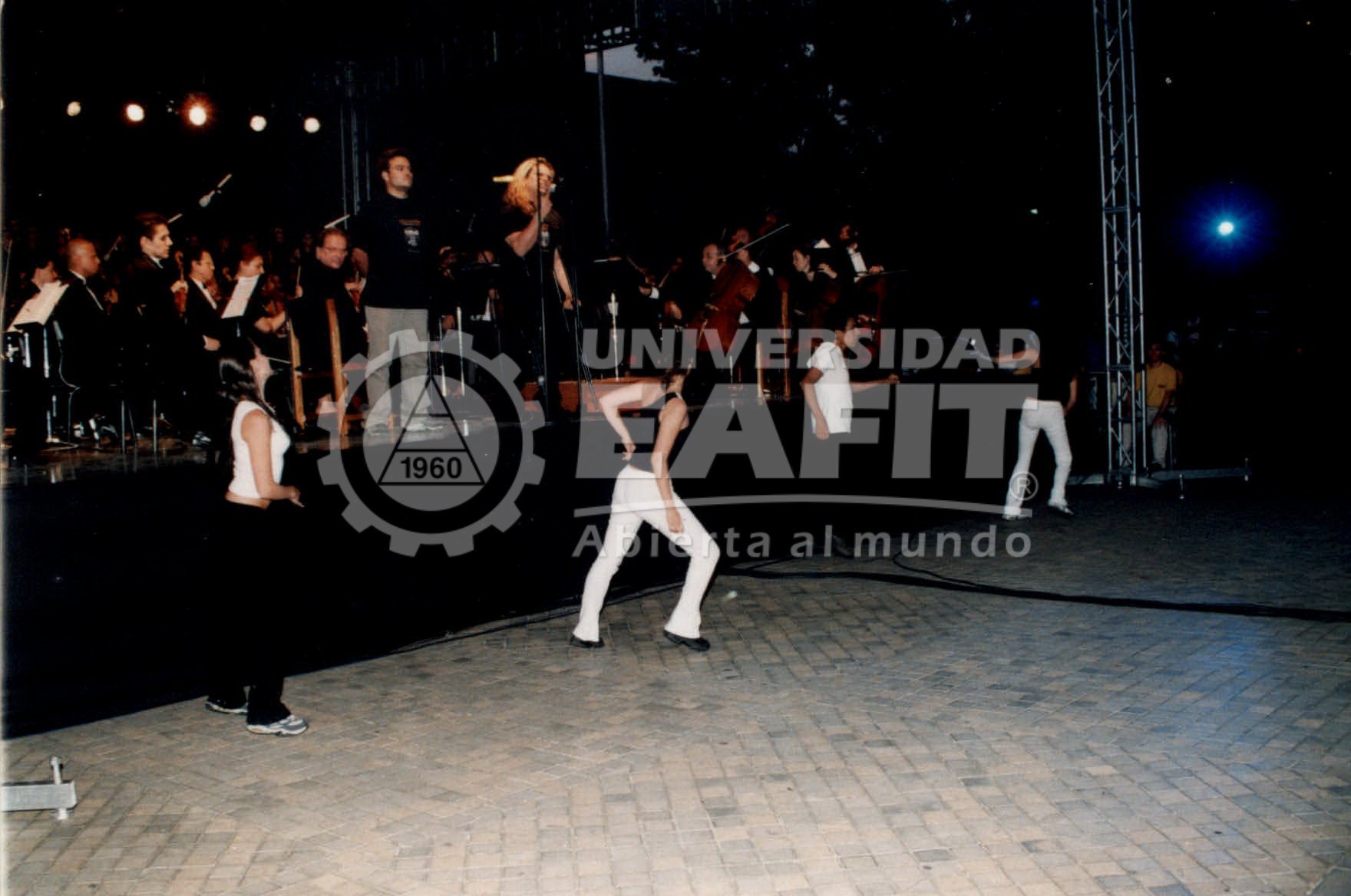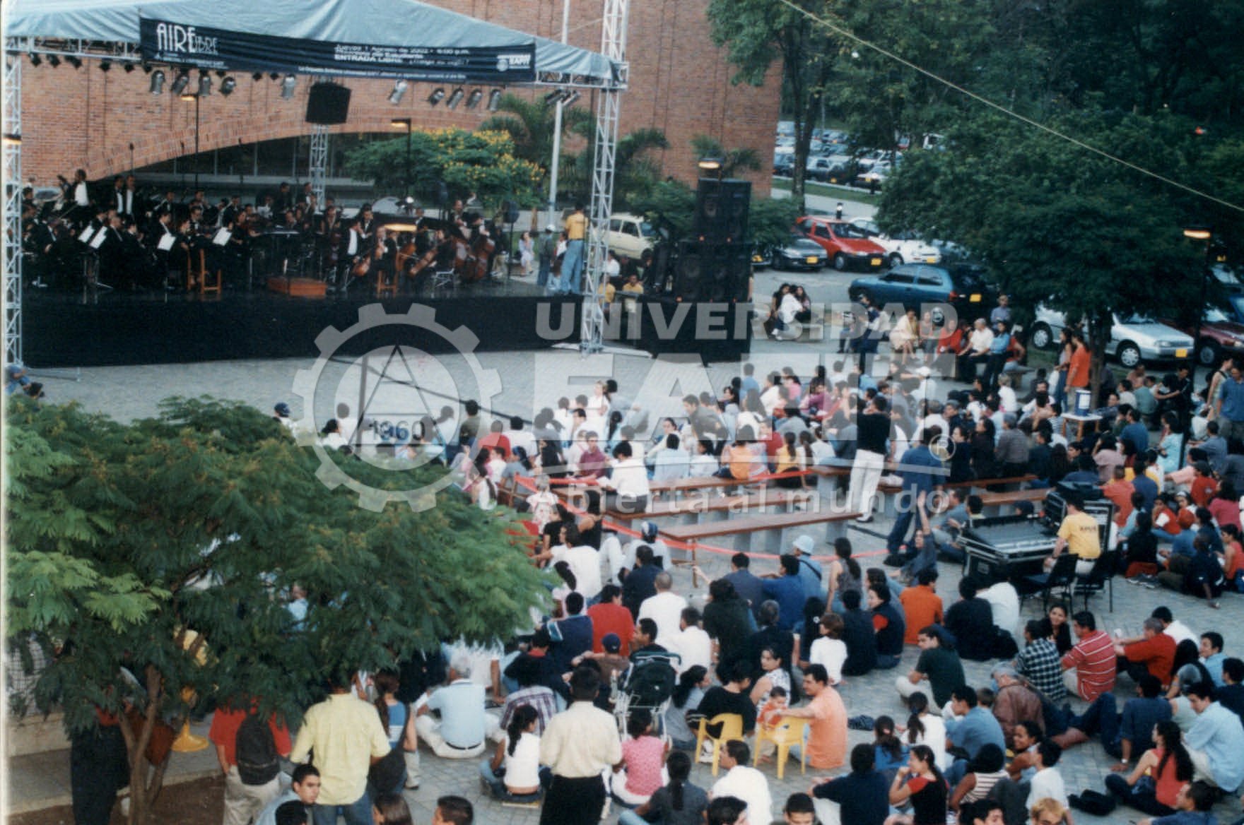 Fotografías tomadas durante un concierto al aire libre de la Orquesta Sinfónica EAFIT, desde diferentes ángulos, en el año 2002. La Orquesta Sinfónica EAFIT fue creada a comienzos del año 2000 para llenar un vacío existente en la ciudad desde que desapareció la Orquesta Sinfónica de Antioquia (OSDA). En su segundo año de funcionamiento (2001), la Orquesta recibió el premio de Colombiano Ejemplar, otrogado por el periódico El Colombiano de Medellín, en la categoría de Cultura.