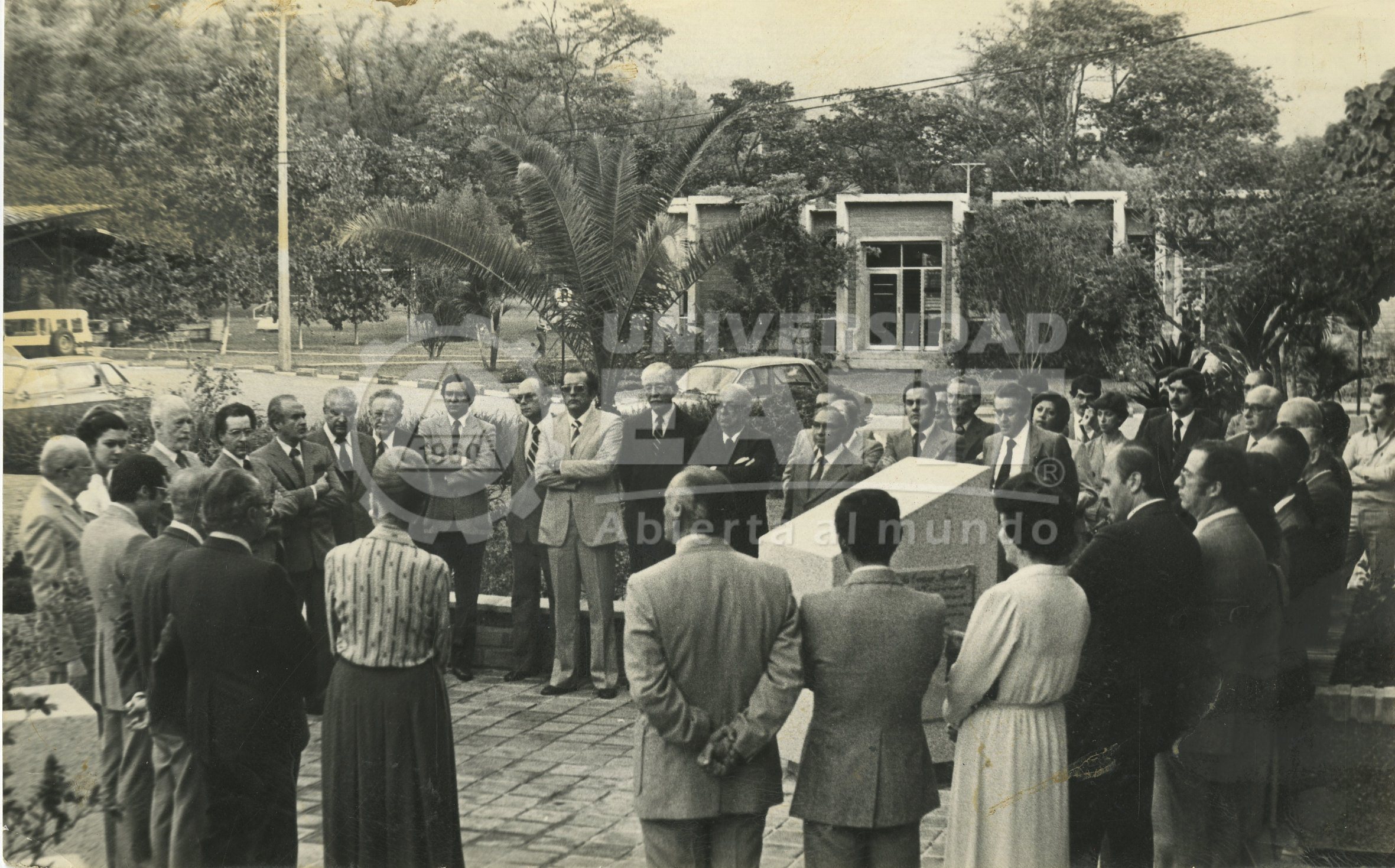 Fotografía tomada durante la inauguración de la plazoleta con las placas a los fundadores, primeros graduados y rectores, hoy ubicada frente al bloque 26, el 29 de julio de 1981. Vista lateral.