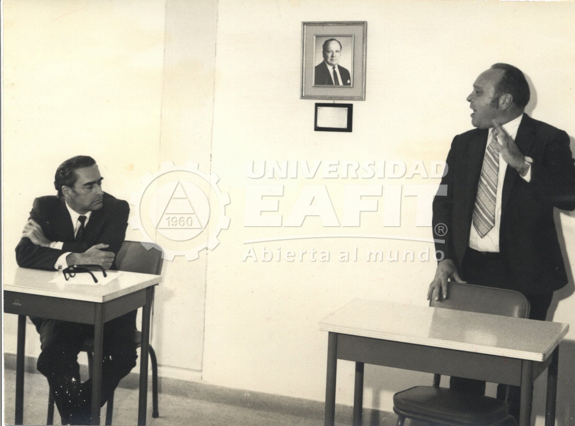 Fotografías tomadas durante la celebración del homenaje al Doctor Allen B. Dickerman, por directivos de la Universidad, el 17 de septiembre de 1971. El profesor Allen B. Dickerman, de la Syracuse University (College of Business Administration) fue enviado a la Universidad Eafit a principios del año 1962, con el fin de propiciar un acercamiento con la Escuela y plantear un posible acuerdo de cooperación. Vinculado luego a la Univerisity of Georgia, fue el responsable desde la Syracuse University del proyecto de cooperación con EAFIT y propuso algunas reformas al plan de Estudios simultáneos y algunas observaciones sobre la carrera de Administración en su plan de estudios convencional.