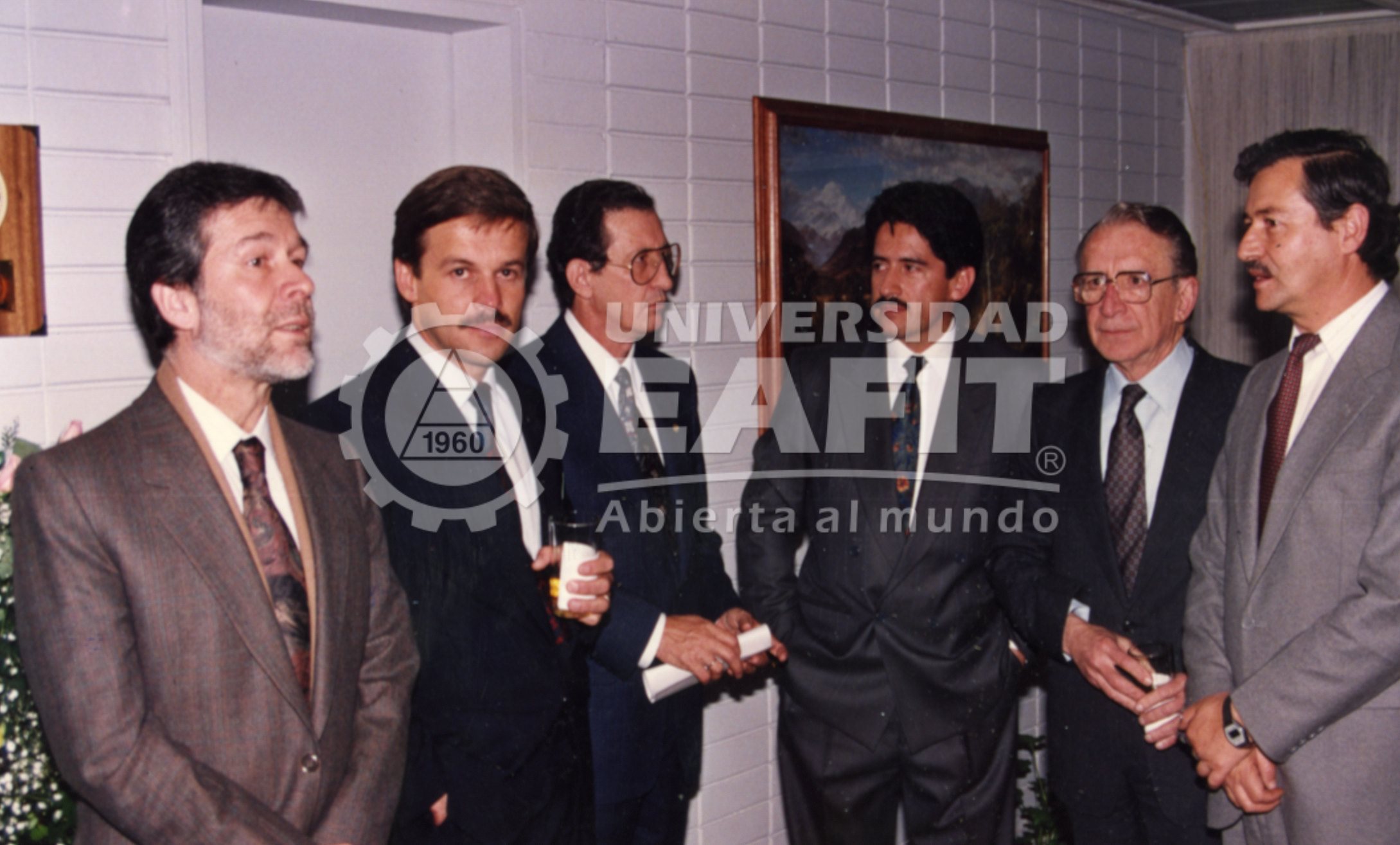 Fotografía tomada durante la inauguración de la sede de la Universidad Eafit en Bogotá, el 26 de septiembre de 1991, en la que se retrata a los directivos desde una vista frontal. La Universidad adquirió una nueva casa a solo una cuadra de la anterior (carrera 16 número 93-46), en la que albergaría al equipo de trabajo, con el fin de encaminar la operación de servicios y cursos de educación continua que se pretendía ofrecer en la ciudad. Tomado de http://goo.gl/E4LOaz