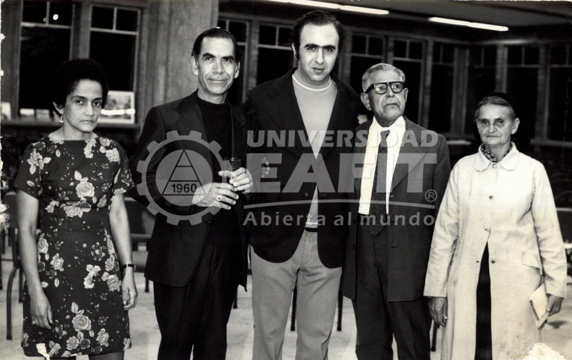 Fotografía grupal tomada al grupo de empleados de mayor antigüedad en compañía del Rector, durante la celebración de los quince años de fundación de la Universidad. Vista frontal.