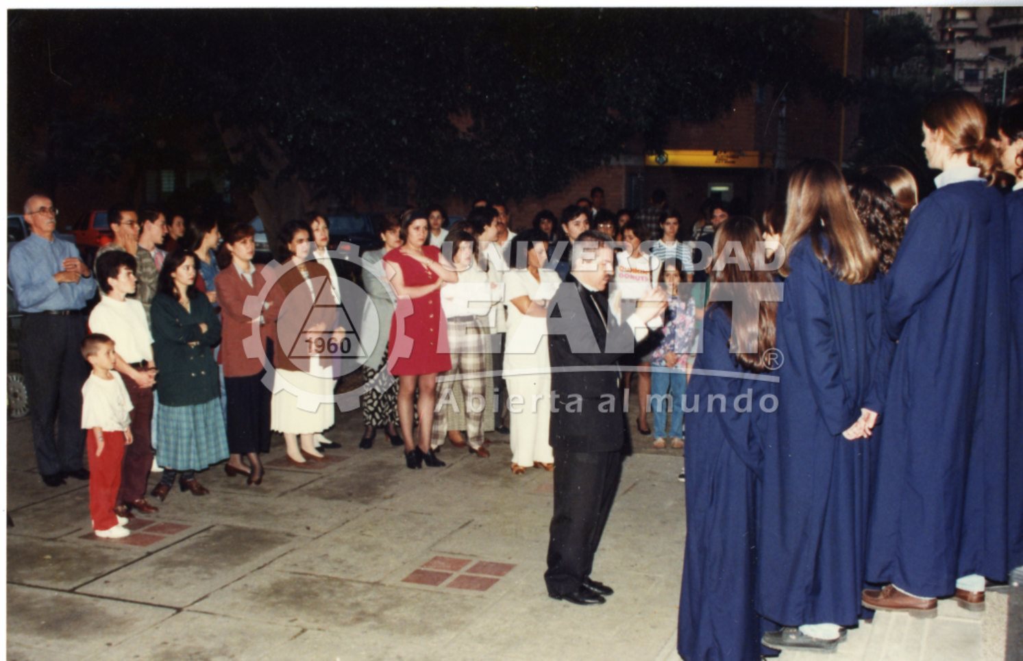 Fotografías tomadas durante la fiesta de navidad "Coro de campanas" en compañía del coro de la Universidad, en la que se retratan músicos y asistentes desde diferentes ángulos, el 9 de diciembre de 1996. Se desconoce el lugar de las fotografías.