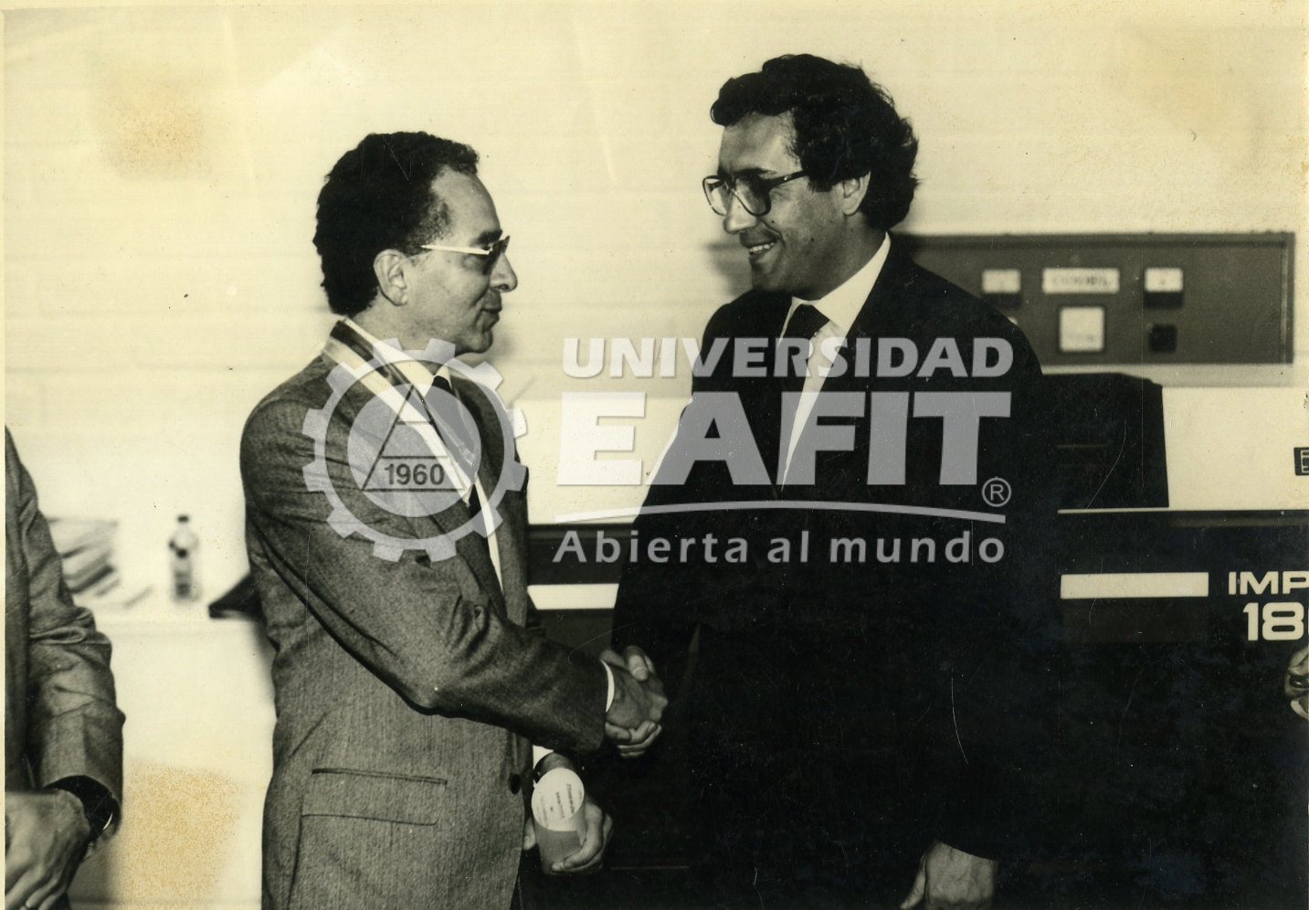 | dc.description.abstract | Fotografía tomada durante la inauguración del Centro de Cómputo de la Universidad, el 1 de junio de 1983, así como la entrega de la condecoración Francisco de Paula Santander a la Universidad Eafit, llevadas a cabo en el Centro de Cómputo, hoy bloque 26, nivel 1-sur, en la que se retrata al entonces Rector de la Universidad Eafit, Héctor Ochoa Díaz, dando un apretón de manos al Ministro de Educación Nacional, Jaime Arias Ramírez. En julio del año 1975, se decidió crear el Centro de Cómputo, con el triple propósito de ofrecer apoyo computacional apropiado para las actividades académicas del proyectado programa de Ingeniería de Sistemas y de las demás carreras. La creación de esta dependencia marcó la entrada definitiva de Eafit a la era de la computación. Cerca de diez años más tarde, el Centro de Cómputo pasaría a llamarse: Centro de Informática. | spa |