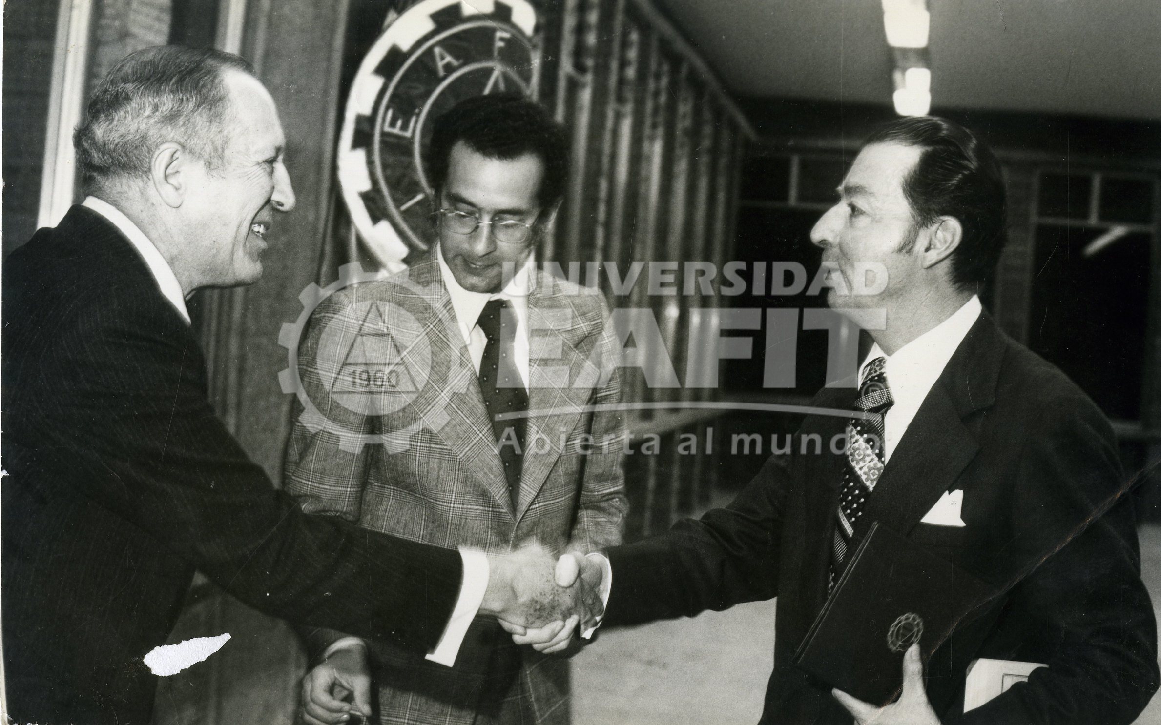 Fotografía tomada durante el homenaje rendido a los fundadores y ex-rectores de la Universidad EAFIT, en el año 1981, en la que se retrata al entonces rector de la Universidad, Héctor Ochoa Díaz junto a Luis Echavarría Villegas, Presidente del Consejo Superior y Javier Toro Martínez, ex-rector de la Universidad.