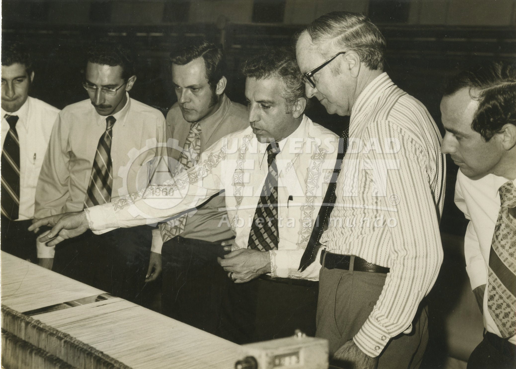 Fotografía grupal tomada de los integrantes de la Misión de The University of Georgia durante la visita a las instalaciones de Fabricato. Vista lateral. El Plan Máster en Administración y su diseño se efectuó mediante la cooperación de dicha misión. Dentro de los profesores de la misión se encontraban los Drs. Richard Still, Robert Tritt Asterios Kefalas, Mark Greene, Howard Smith y el Decano Flewellen.