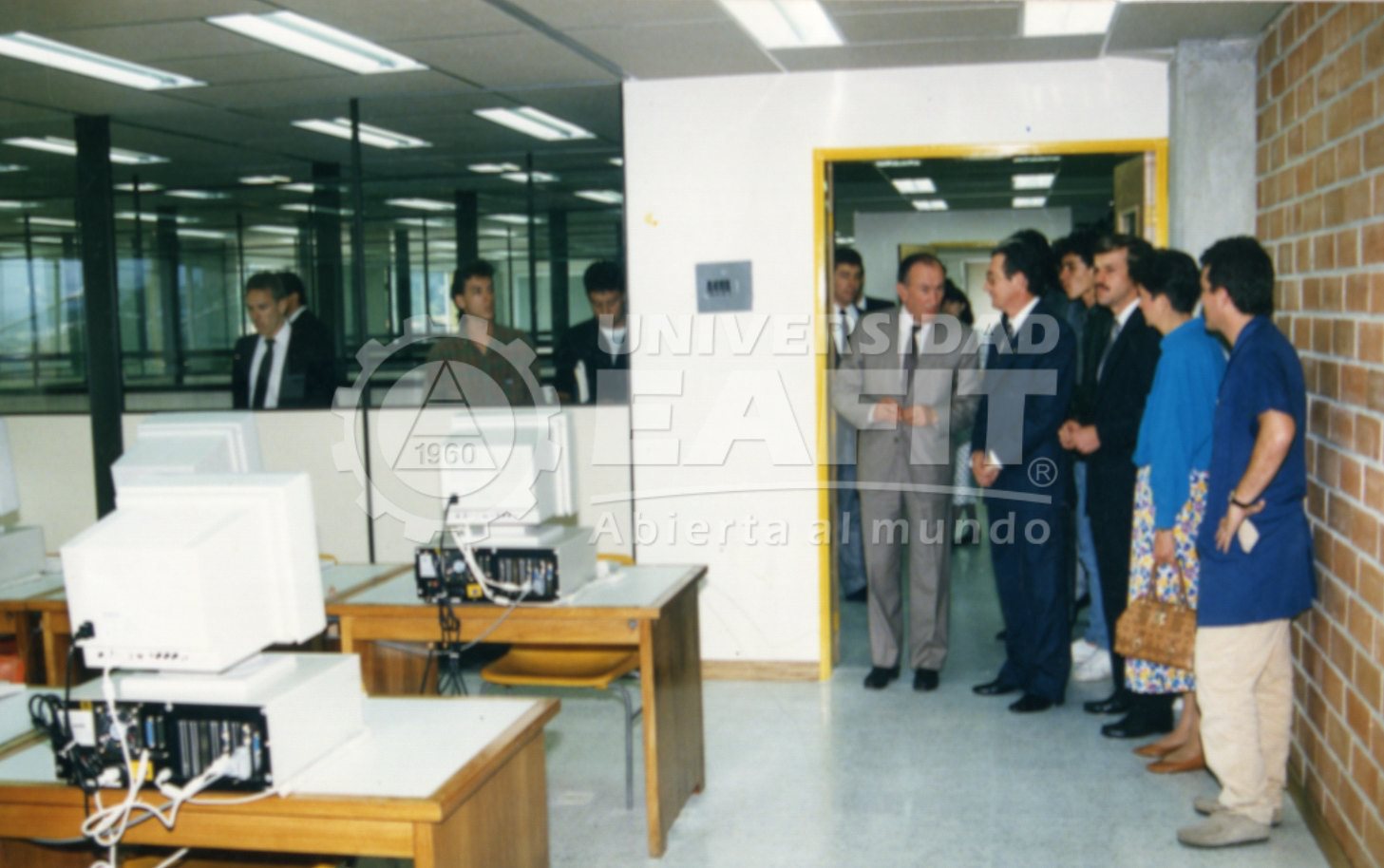 Fotografía tomada durante la inauguración de la sala de microcomputadores, el 30 de marzo de 1983, en la que se retratan, desde una vista general, a Gilberto Echeverry Mejía, Juan Guillermo Arango, Jorge Herrera y Mónica de Bedut. Dicha sala fue dotada con computadores APPLE II-e, y su objetivo principal se enfocaba al uso intensivo y extensivo de la computación, así como a la ampliación en el acceso a la tecnología, mediante salas para públicos diversos, tanto internos como externos.