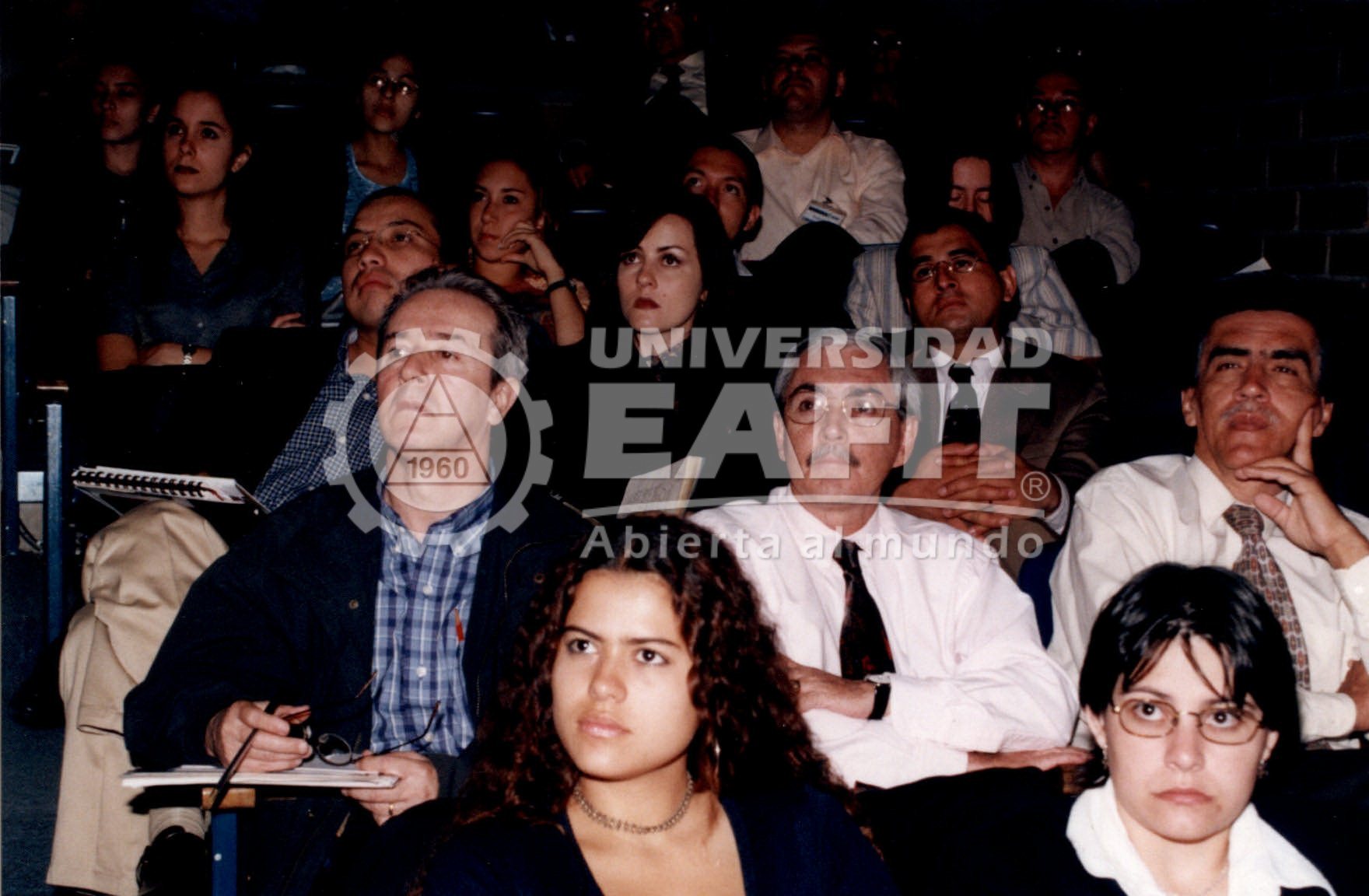 Fotografías tomadas durante la Presentación del Centro de Estudios Internacionales, en la que se retrata al rector Juan Felipe Gaviria y al público invitado desde diferentes ángulos.