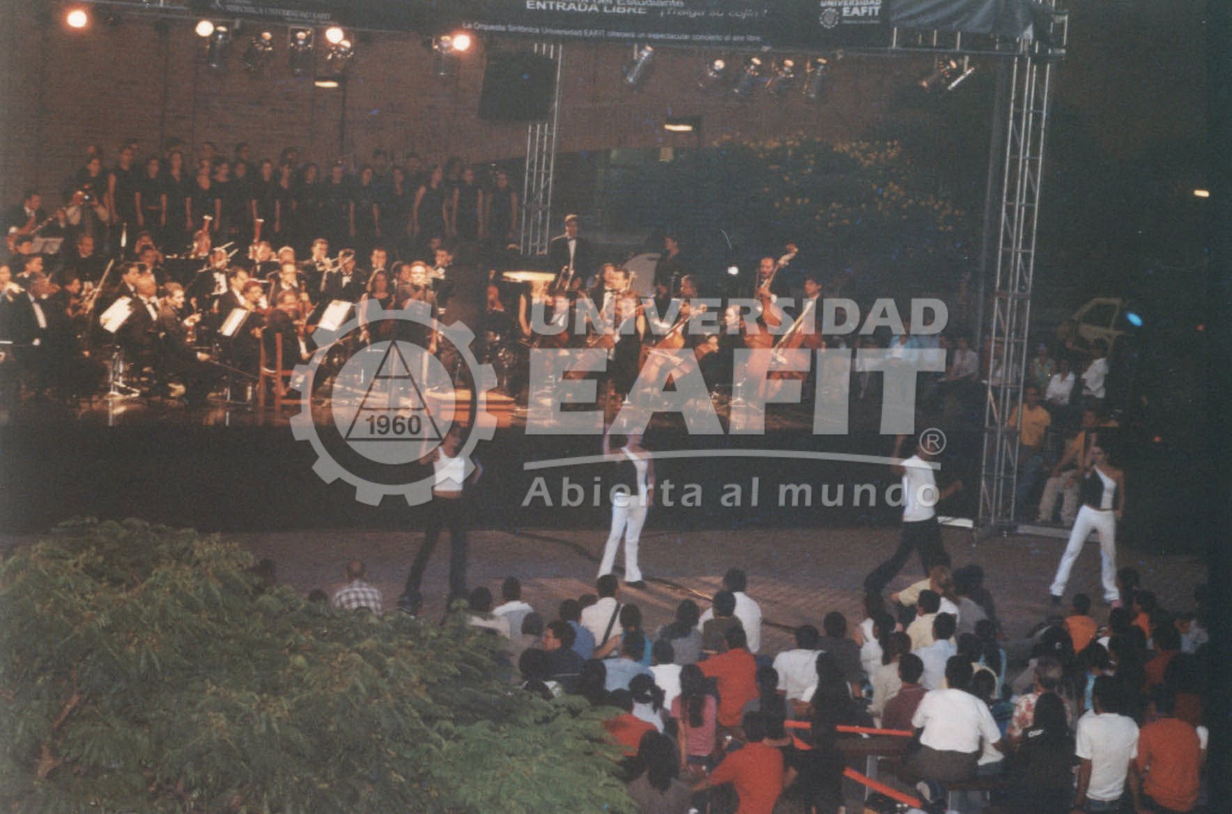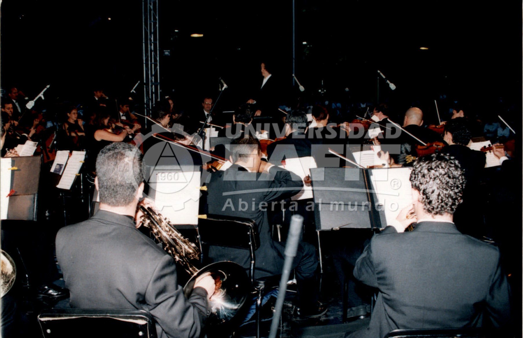 Fotografías tomadas durante un concierto al aire libre de la Orquesta Sinfónica EAFIT, desde diferentes ángulos, en el año 2002. La Orquesta Sinfónica EAFIT fue creada a comienzos del año 2000 para llenar un vacío existente en la ciudad desde que desapareció la Orquesta Sinfónica de Antioquia (OSDA). En su segundo año de funcionamiento (2001), la Orquesta recibió el premio de Colombiano Ejemplar, otrogado por el periódico El Colombiano de Medellín, en la categoría de Cultura.