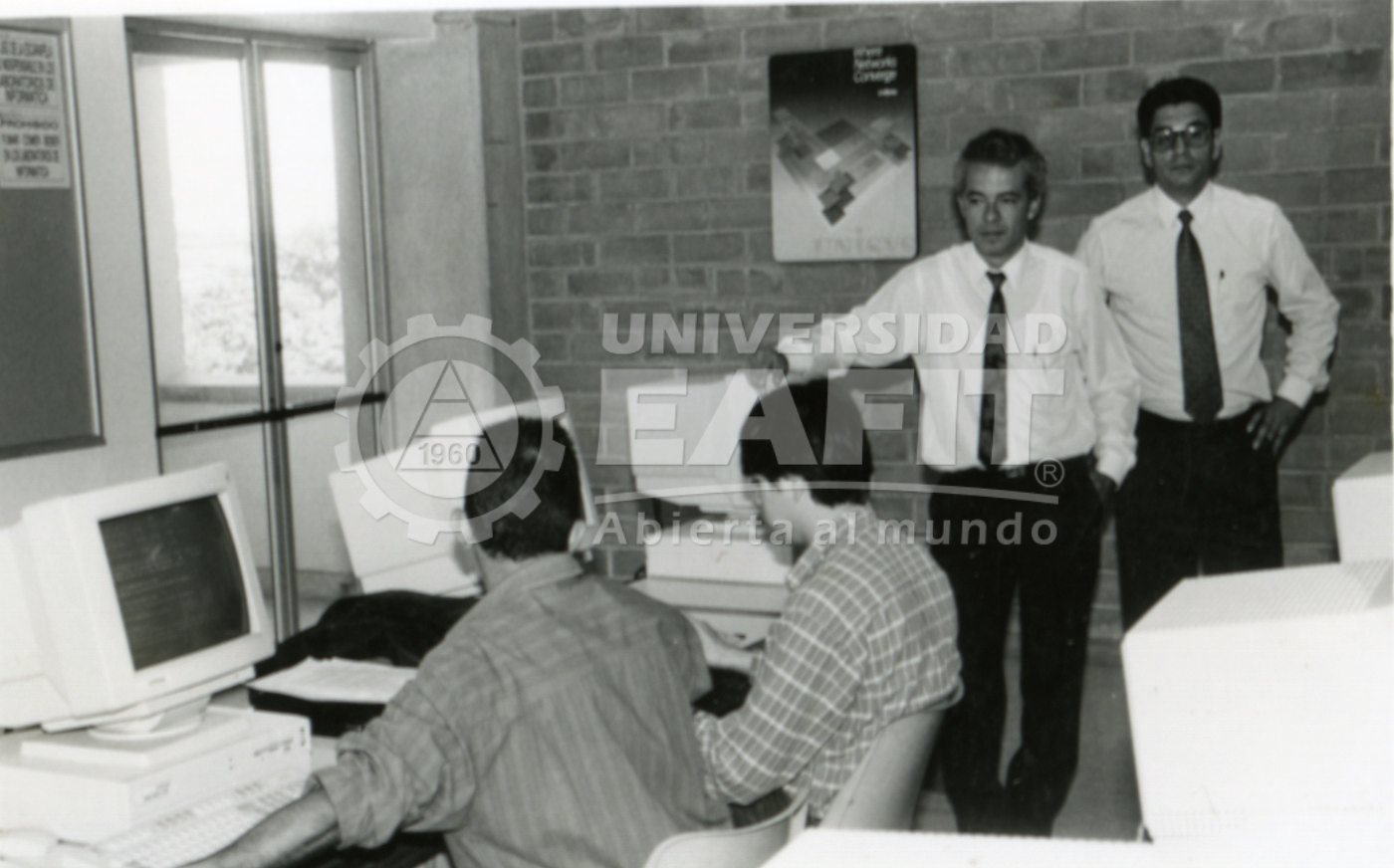 Fotografías tomadas durante la inauguración de la sala de microcomputadores, el 30 de marzo de 1983, en la que se retratan estudiantes y profesores haciendo uso de las herramientas del lugar, desde diferentes ángulos. Dicha sala fue dotada con computadores APPLE II-e, y su objetivo principal se enfocaba al uso intensivo y extensivo de la computación, así como a la ampliación en el acceso a la tecnología, mediante salas para públicos diversos, tanto internos como externos.