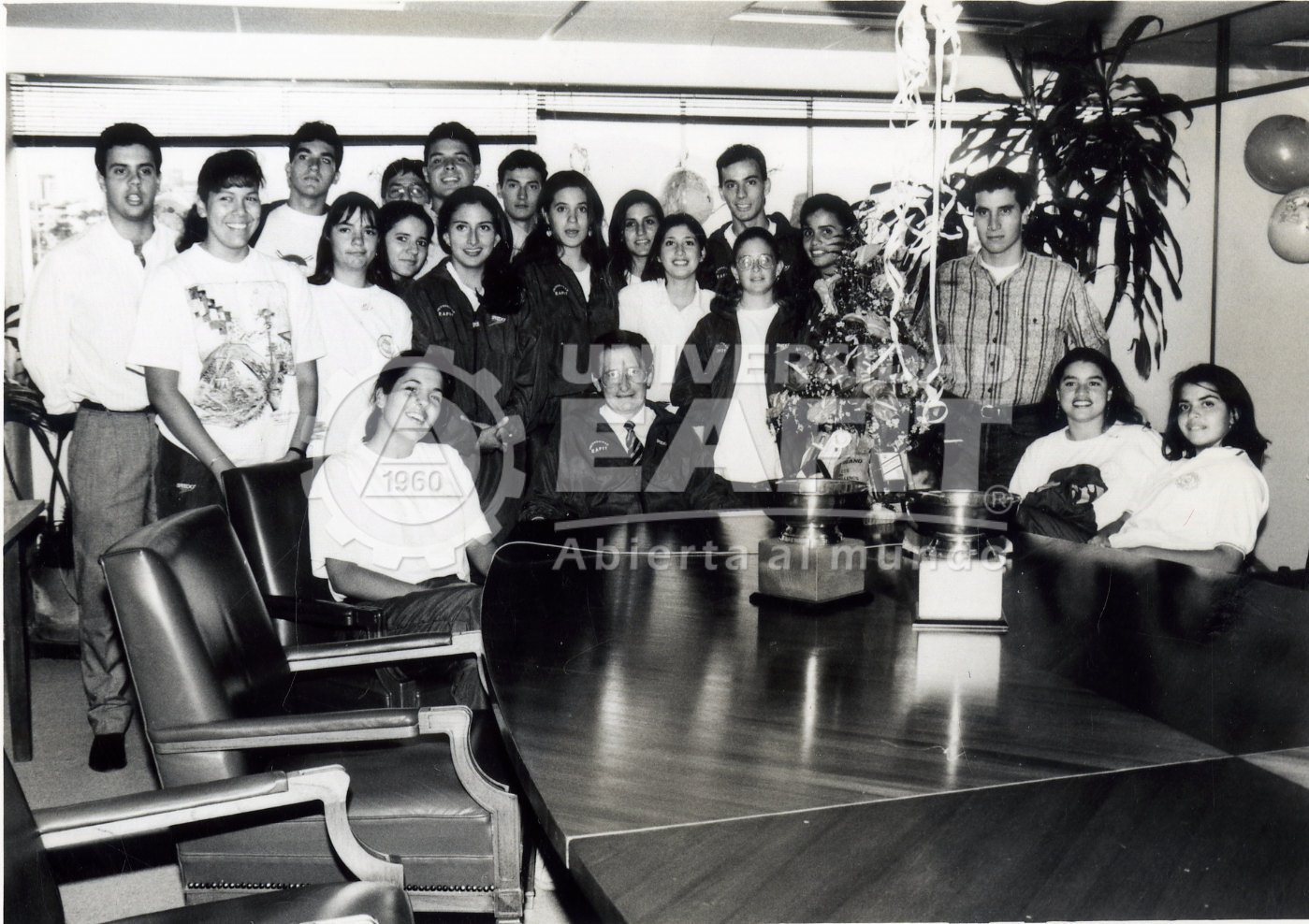Fotografía tomada durante la Celebración del cumpleaños del rector Guillermo Sanín Arango, el 1 de octubre de 1993, por parte de los deportistas de la Universidad en la Rectoría. Vista frontal