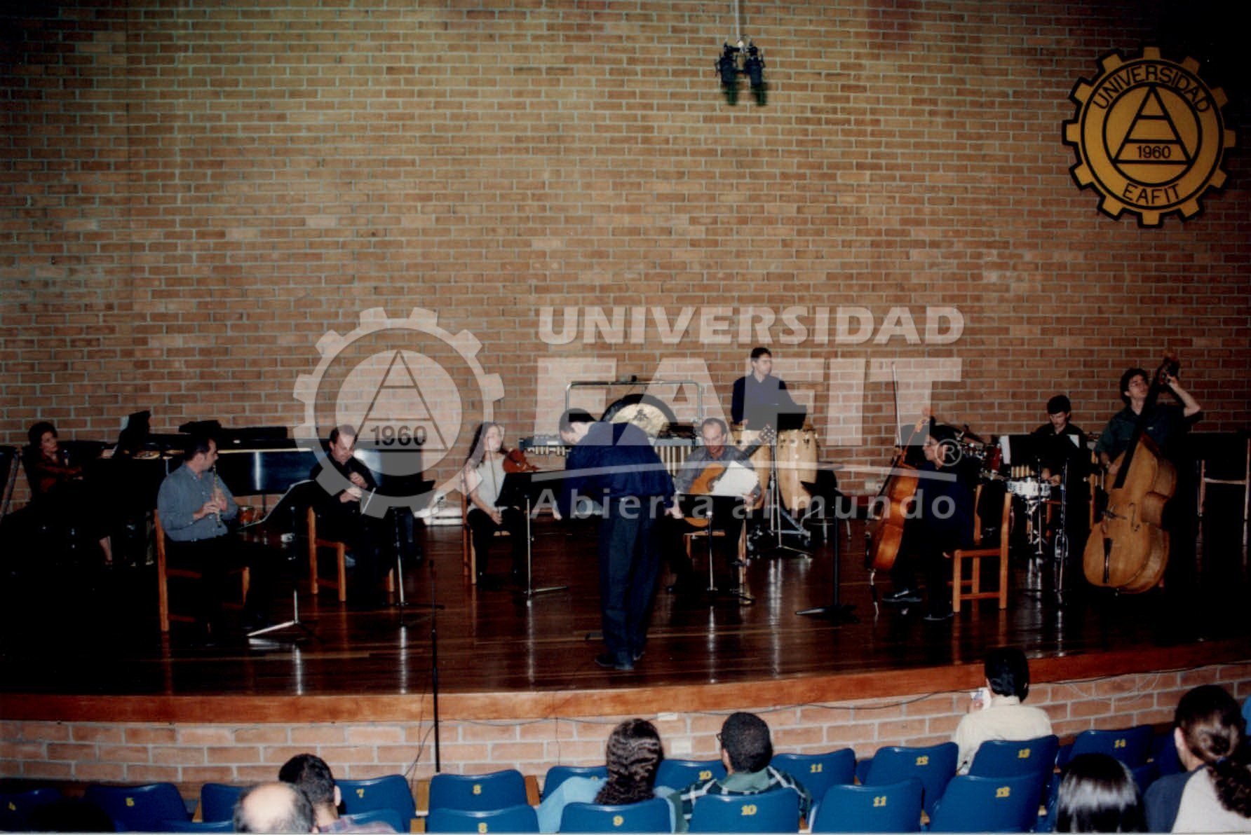 Fotografías tomadas durante el lanzamiento del grupo ensamble periscopio, en el año 2001, desde diferentes ángulos. El Ensamble Periscopio de la Universidad EAFIT, tiene como objetivo despertar el interés en los estudiantes por la interpretación de la música contemporánea, tanto del repertorio estándar universal como de autores colombianos y latinoamericanos y las nuevas propuestas de los estudiantes de composición de la universidad y otros proyectos que envuelvan la estética de la música erudita actual. Tomado de http://goo.gl/E5L0a3