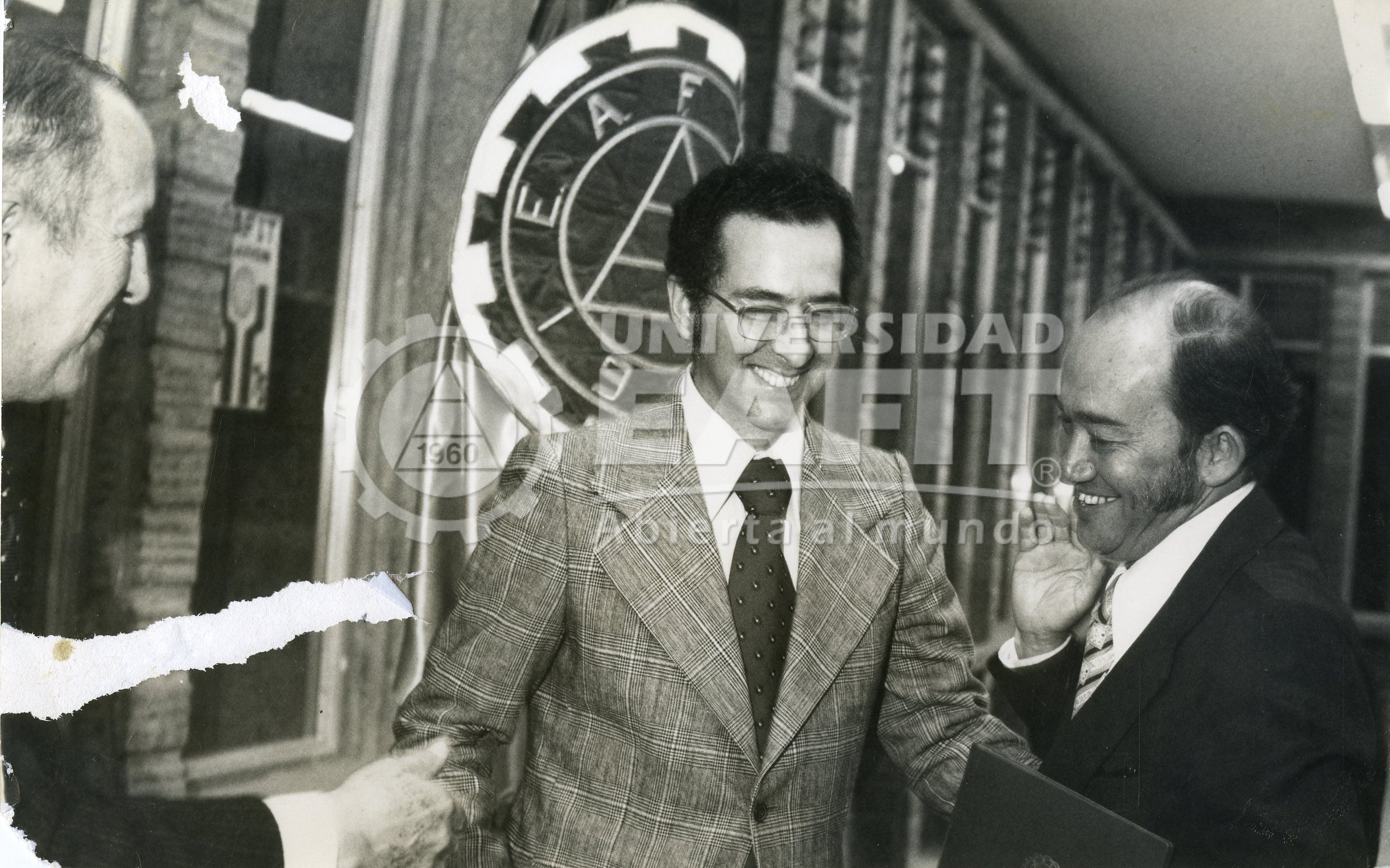 Fotografía tomada durante el homenaje rendido a los fundadores y ex-rectores de la Universidad EAFIT, en el año 1981, en la que se retrata al entonces rector de la Universidad, Héctor Ochoa Díaz junto al Presidente del Consejo Superior, Luis Echavarría Villegas (de perfil) y Hernán Gómez González, ex-rector de la Universidad.